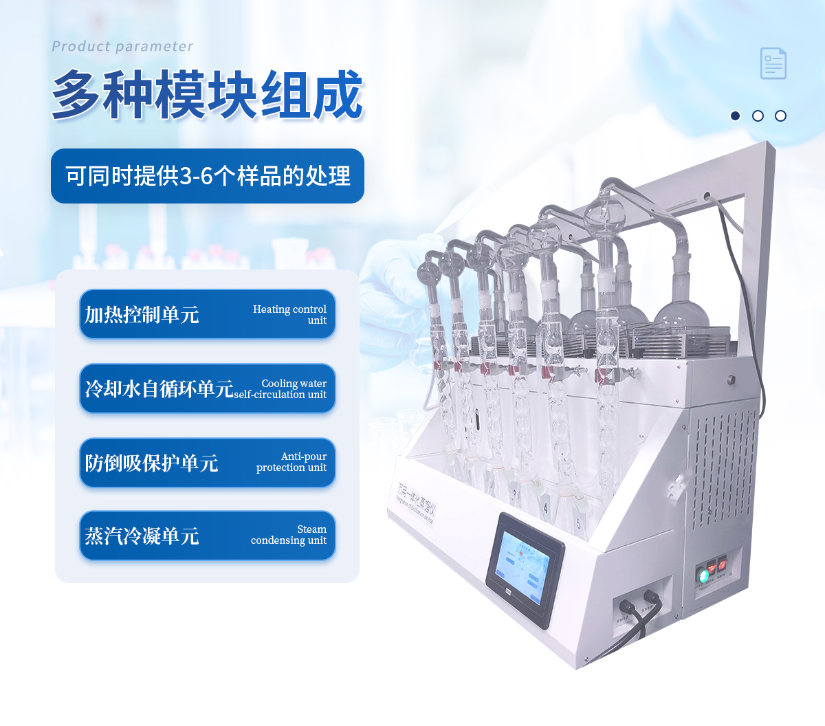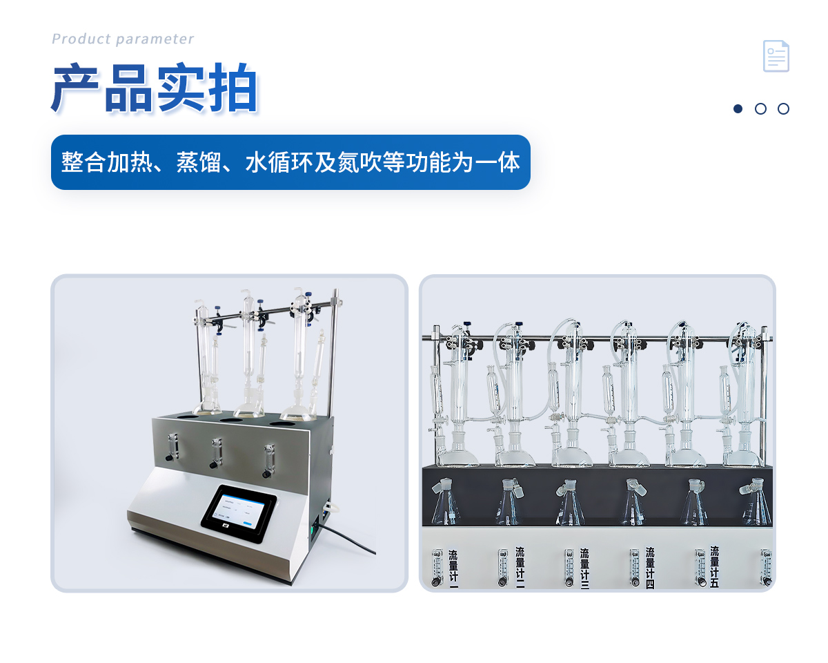 主要原理是根據藥典中所提供的檢測方法,將中藥材以蒸餾法進行處理,樣品中的亞硫酸鹽系列物質加酸處理后轉化為二氧化硫后,隨氮氣流帶入到含有雙氧水的吸收瓶中,雙氧水將其氧化為硫酸根離子,采用酸堿滴定法測定,計算藥材及飲片中的二氧化硫殘留量。本產品在嚴格遵循藥典要求的基礎上,整合加熱,蒸餾,水循環及氮吹等功能為一體,可同時提供3-5個樣品(空白樣,平行樣)的處理,從而極大的提高了檢測數據的精度和減少了工作時間。