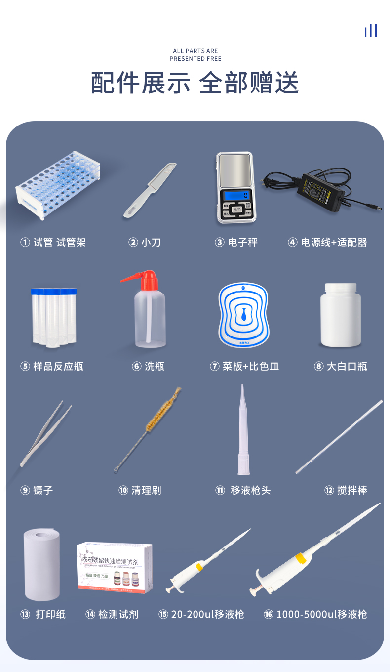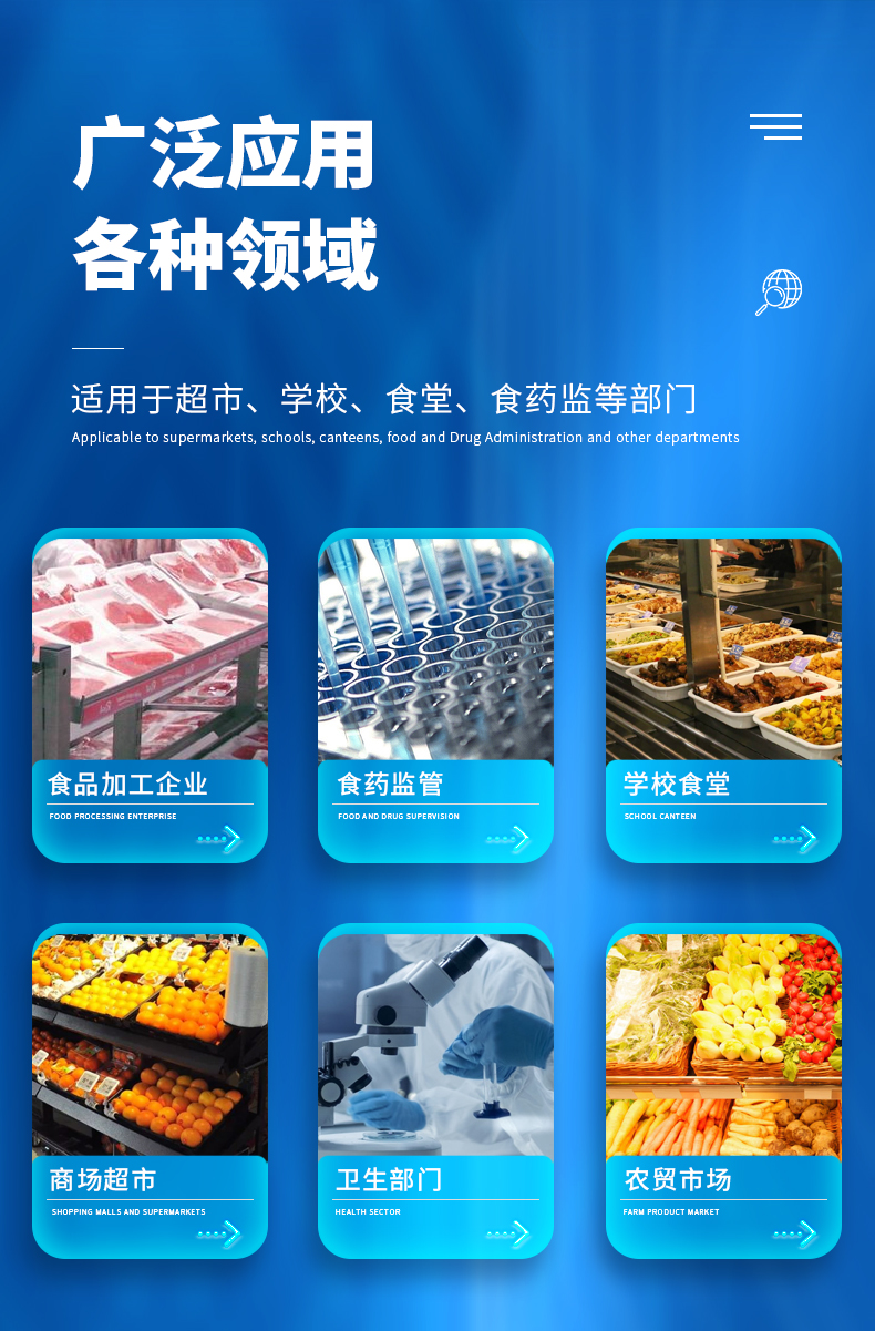 廣泛應用于主要用于蔬菜、水果、茶葉、糧食、農副產品等食品中有機磷和氨基甲酸酯類農藥殘留的快速檢測;此外還可用于果蔬茶生產基地和農貿批發銷售市場現場檢測,餐館、學校、食堂、家庭果蔬加工前的安全速測等。