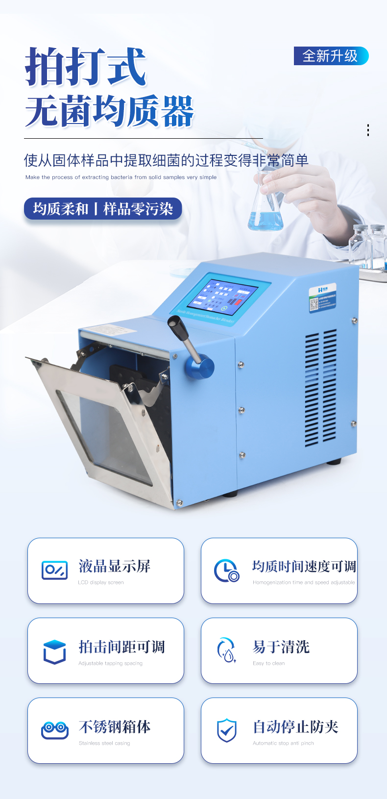 應(yīng)用領(lǐng)域:食品微生物分析;動(dòng)物組織、生物樣品、化妝品的均質(zhì)處理;肉、魚(yú)、蔬菜、水果、餅干;藥品的微生物分析等;