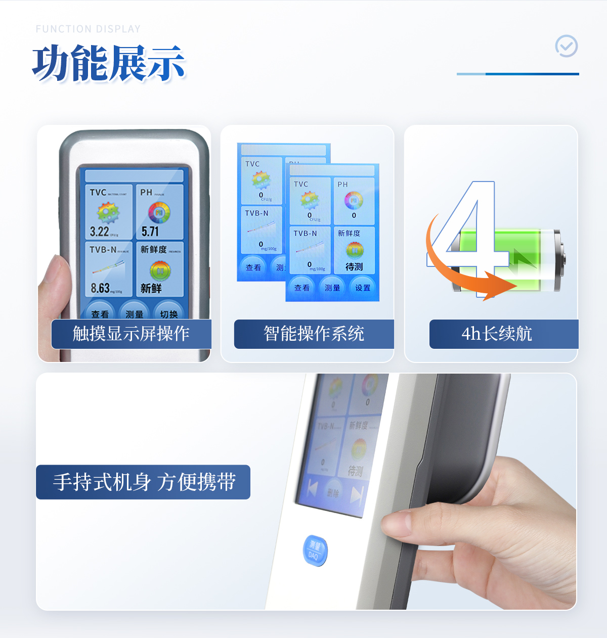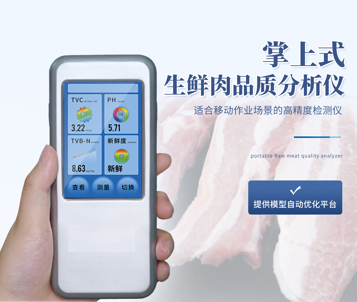 產品簡介:聯合中國農業大學彭彥昆教授團隊研發的掌上式生鮮肉新鮮度分析儀,可用于檢測生鮮肉的TVC、pH、TVB-N、新鮮度、L*、A*、··· 熱線:133-7109-8225