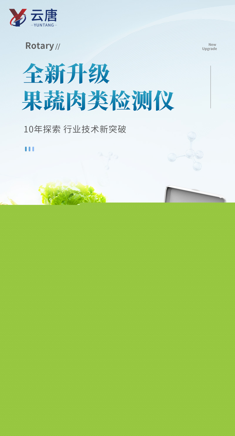 山東云唐智能科技有限公司生產(chǎn)的果蔬肉類檢測儀,采用臺式一體化設(shè)計(jì),可快速檢測幾十種項(xiàng)目,包含各種蔬菜水果中有機(jī)磷和氨基甲酸酯類農(nóng)藥殘留,病害肉診斷:肉中組胺、揮發(fā)性鹽基氮;各種肉食品中瘦肉精激素類殘留、抗生素、獸藥殘留等現(xiàn)場的定性定量檢測。