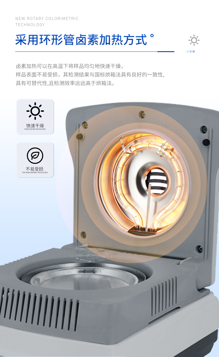 環狀的鹵素燈確保樣品得到均勻加熱,操作簡便、測量準確。水分測定儀在測量樣品重量的同時,儀器采用環形管鹵素加熱方式,快速干燥樣品,在干燥過程中,水分儀持續測量并即時顯示樣品丟失的水分含量%,干燥程序完成后,*終測定的水分含量值被鎖定顯示。與國際烘箱加熱法相比,鹵素加熱可以在高溫下將樣品均勻地快速干燥,樣品表面不易受損,其檢測結果與國標烘箱法具有良好的一致性,具有可替代性,且檢測效率遠遠高于烘箱法。智能化操作,一般樣品只需幾分鐘即可完成測定。該儀器操作簡單,測試準確,顯示部分采用液晶顯示屏-使屏幕更加清晰明亮,示值清晰可見,分別可顯示水分值,樣品初值,終值,測定時間,溫度初值,*終值等數據,并具有與計算機,打印機連接功能、符合GLP規范的打印數據輸出。