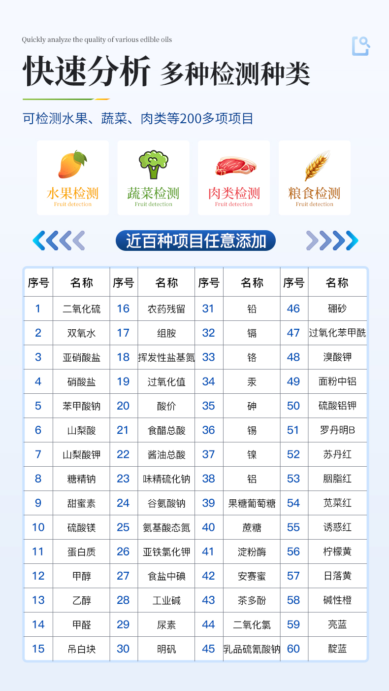 高精度食品安全檢測(cè)儀YT-SA60Z檢測(cè)項(xiàng)目: