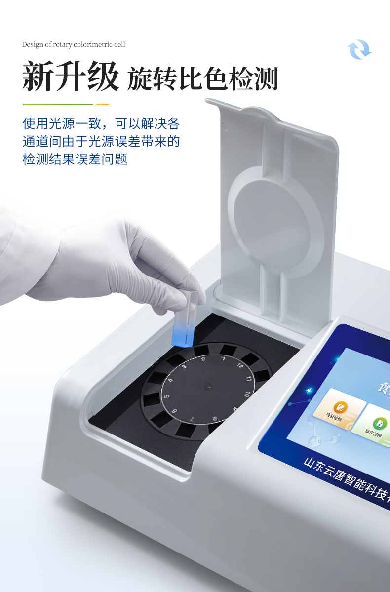 4、檢測(cè)通道:12通道;采用精密旋轉(zhuǎn)比色池設(shè)計(jì),使用同芯片同光源校準(zhǔn)精度,解決不同光源之間的誤差值,更加準(zhǔn)確**。