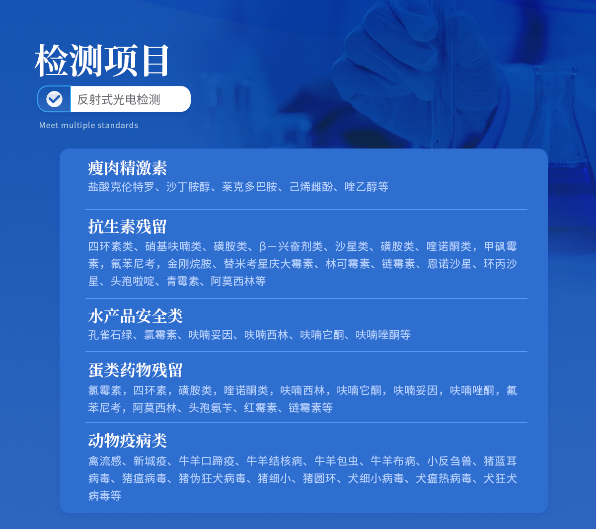 | 瘦肉精激素:鹽酸克倫特羅、沙丁胺醇、萊克多巴胺、己烯雌酚、喹乙醇等 | 抗生素殘留:四環(huán)素類、硝基呋喃類、磺胺類、β-興奮劑類、沙星類、磺胺類、喹諾酮類,甲砜霉素,氟苯尼考,金剛烷胺、替米考星、慶大霉素、林可霉素、鏈霉素、恩諾沙星、環(huán)丙沙星、頭孢啦啶、青霉素、阿莫西林等 | 水產(chǎn)品安全類:孔雀石綠、氯霉素、呋喃妥因、呋喃西林、呋喃它酮、呋喃唑酮等 | 蛋類藥物殘留 氯霉素,四環(huán)素,磺胺類,喹諾酮類,呋喃西林,呋喃它酮,呋喃妥因,呋喃唑酮,氟苯尼考,阿莫西林、頭孢氨芐、紅霉素、鏈霉素等 | 動物疫病類:禽流感、新城疫、牛羊口蹄疫、牛羊結(jié)核病、牛羊包蟲、牛羊布病、小反芻獸、豬藍(lán)耳病毒、豬瘟病毒、豬偽狂犬病毒、豬細(xì)小、豬圓環(huán)、犬細(xì)小病毒、犬瘟熱病毒、犬狂犬病毒等 |