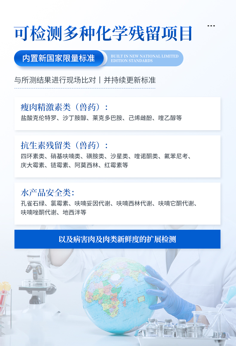 抗生素殘留檢測儀可現場快速檢測多類別抗生素類殘留,如可快速檢測四環素類、硝基呋喃類、磺胺類、沙星類、喹諾酮類、氯霉素、慶大霉素、鏈霉素、喹乙醇代謝物、硫酸鏈霉素、羧芐青霉素、噻孢菌素鈉、阿莫西林、氨芐西林、紅霉素、潮霉素B、安普霉紊、桿菌肽、氨丙琳、芐青霉家、頭孢噻呋、克拉維酸、氯羥吡啶、阿散酸等抗生素快速檢測;水產獸藥:呋喃妥因代謝、呋喃西林代謝、呋喃它酮代謝、呋喃唑酮代謝、孔雀石綠等。