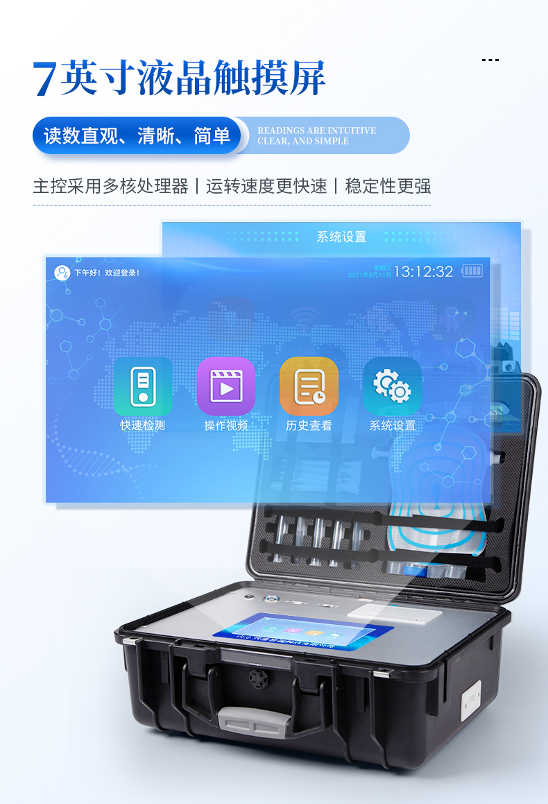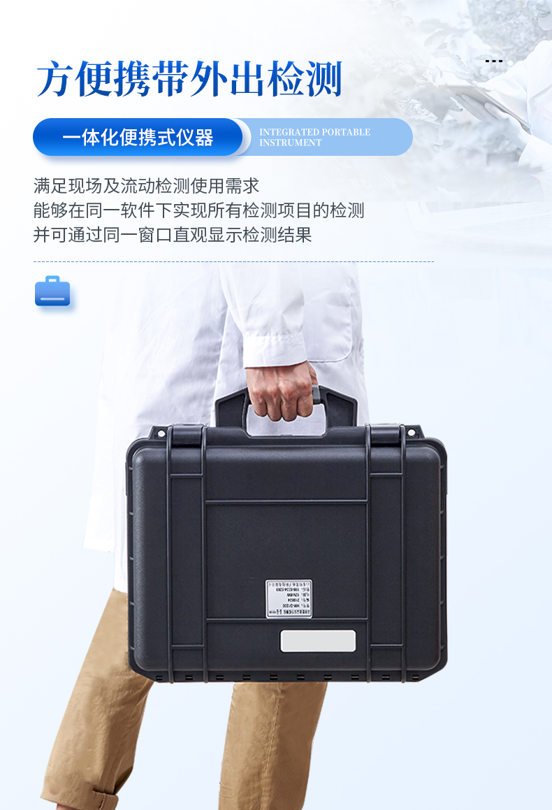 7、一體化便攜式快檢設備,滿足現場及流動檢測使用需求,能夠在同一軟件下實現所有檢測項目的檢測,并可通過同一窗口直觀顯示檢測結果。
