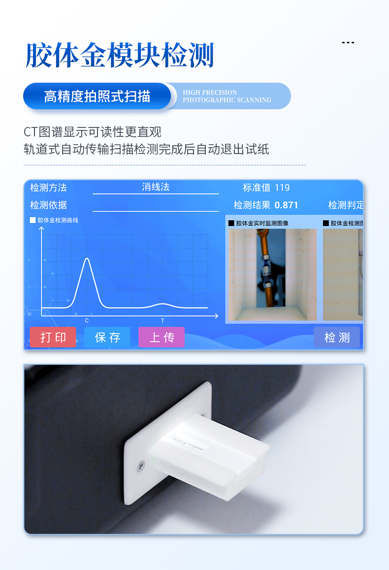 8、膠體金模塊檢測方式:軌道式自動傳輸掃描,檢測完成后自動退出檢測卡。