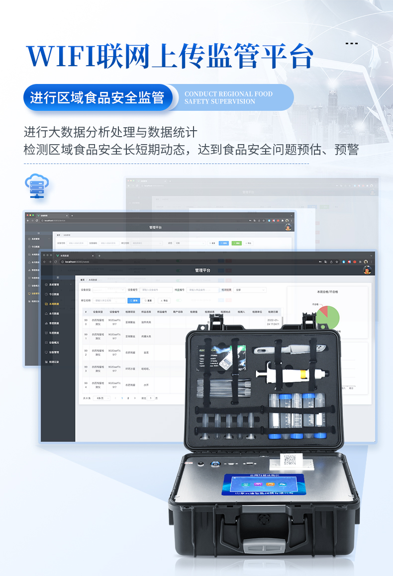 5、儀器帶有監管平臺,數據可局域網和互聯網數據上傳,檢測結果直接傳至食品安全監管平臺。進行區域食品安全監管及大數據分析處理與數據統計,檢測區域食品安全長短期動態,達到食品安全問題預估、預警