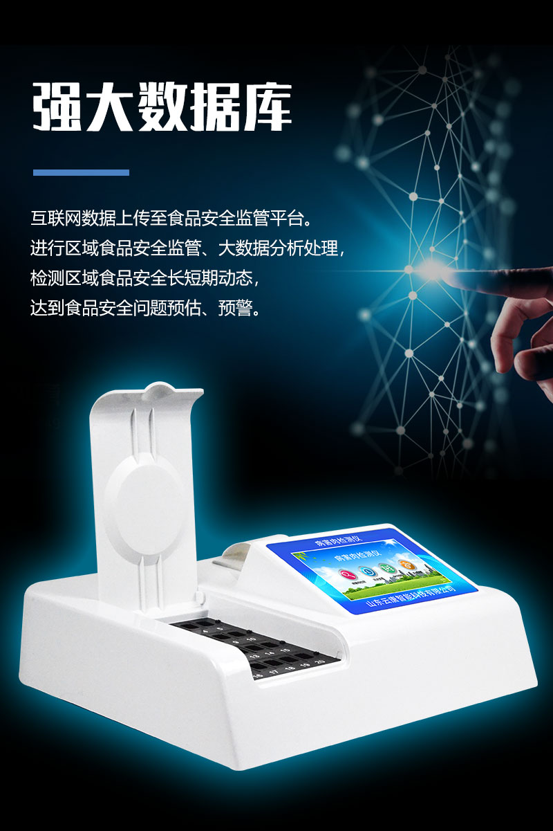 8、儀器帶有監(jiān)管平臺。數(shù)據(jù)可局域網(wǎng)和互聯(lián)網(wǎng)數(shù)據(jù)上傳,檢測結(jié)果直接傳至食品安全監(jiān)管平臺。進行區(qū)域食品安全監(jiān)管及大數(shù)據(jù)分析處理,檢測區(qū)域食品安全長短期動態(tài),達到食品安全問題預(yù)估、預(yù)警