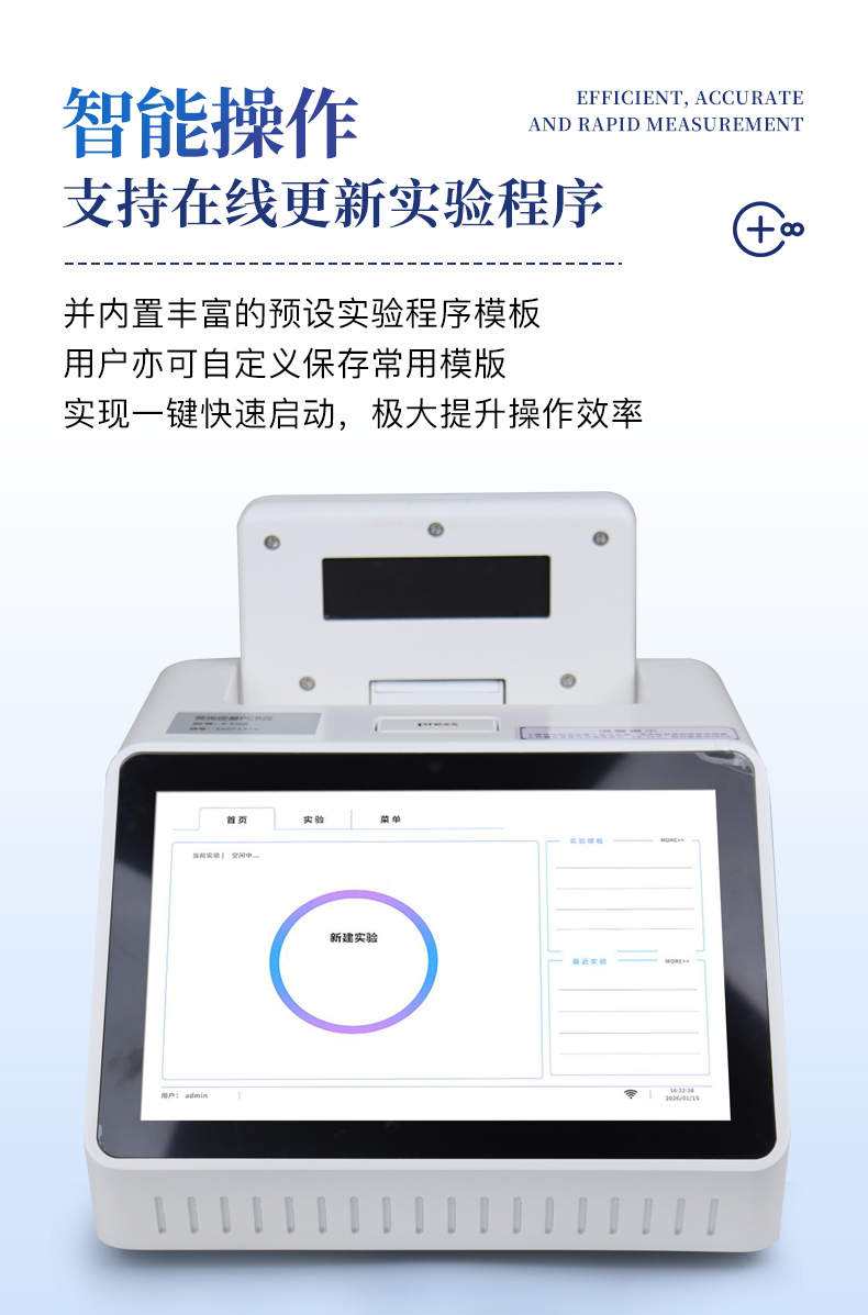 | 1.智能操作系統(tǒng),實(shí)驗(yàn)盡在掌握 | A雙模式靈活控制:支持通過(guò)儀器觸摸屏獨(dú)立運(yùn)行,也支持通過(guò)電腦軟件進(jìn)行遠(yuǎn)程控制與數(shù)據(jù)管理,適應(yīng)不同實(shí)驗(yàn)場(chǎng)景需求。 | B程序更新與預(yù)設(shè):支持在線更新實(shí)驗(yàn)程序,并內(nèi)置豐富的預(yù)設(shè)實(shí)驗(yàn)程序模板,用戶亦可自定義保存常用模版,實(shí)現(xiàn)一鍵快速啟動(dòng),極大提升操作效率。 | C極簡(jiǎn)啟動(dòng)體驗(yàn)(可選配):可定制集成攝像頭掃描系統(tǒng),用戶只需掃描樣品板或程序卡的二維碼,即可自動(dòng)識(shí)別并調(diào)用對(duì)應(yīng)實(shí)驗(yàn)程序,簡(jiǎn)化流程,避免人為設(shè)置錯(cuò)誤。 | D操作簡(jiǎn)單:無(wú)論是觸摸屏界面還是電腦軟件,均設(shè)計(jì)得直觀易懂,新用戶也能快速上手。預(yù)置常用程序模板,進(jìn)一步簡(jiǎn)化操作流程。 | 2.精準(zhǔn)穩(wěn)定的溫控與光學(xué)核心 | A長(zhǎng)久精準(zhǔn)的溫控系統(tǒng):采用進(jìn)口***TEC半導(dǎo)體制冷模塊,控溫精準(zhǔn)(±0.1°C),孔間溫度均勻性**(≤±0.3°C)。系統(tǒng)穩(wěn)定性卓越,長(zhǎng)期使用性能衰減小,校準(zhǔn)周期長(zhǎng)達(dá)數(shù)年,顯著降低維護(hù)成本與運(yùn)營(yíng)中斷。 | B免維護(hù)的靈敏光學(xué)系統(tǒng):配備4個(gè)獨(dú)立LED光源與4個(gè)獨(dú)立光電二極管檢測(cè)器,實(shí)現(xiàn)四通道熒光同步精準(zhǔn)檢測(cè)。采用超長(zhǎng)壽命進(jìn)口光源,設(shè)計(jì)壽命期內(nèi)免維護(hù),無(wú)需額外校準(zhǔn)或更換,保障檢測(cè)結(jié)果長(zhǎng)期一致性與高靈敏度。 | C卓越的數(shù)據(jù)質(zhì)量:實(shí)驗(yàn)線性相關(guān)性高(R2≥0.999),重復(fù)性優(yōu)異(孔間CV值低),確保定量結(jié)果準(zhǔn)確可靠,數(shù)據(jù)置信度高。 | 3.**便捷的數(shù)據(jù)與輸出管理 | A多重?cái)?shù)據(jù)導(dǎo)出方式:支持通過(guò)USB存儲(chǔ)設(shè)備直接拷貝,或經(jīng)由Wi-Fi無(wú)線網(wǎng)絡(luò)傳輸數(shù)據(jù)至本地服務(wù)器或云端,方便靈活,滿足各類實(shí)驗(yàn)室數(shù)據(jù)管理習(xí)慣。 | B豐富的報(bào)告導(dǎo)出與打印:支持生成并導(dǎo)出多種格式(如PDF、Excel)的實(shí)驗(yàn)報(bào)告。儀器兼容USB熱敏打印機(jī)、藍(lán)牙無(wú)線打印機(jī)及常規(guī)A4打印機(jī),可直接在儀器上或通過(guò)電腦一鍵導(dǎo)出并打印專業(yè)報(bào)告,便于結(jié)果存檔與即時(shí)分享。 | 4.快速**與堅(jiān)固耐用 | A升降溫速度快:優(yōu)化設(shè)計(jì)的溫控系統(tǒng)具備高速升降溫能力,顯著縮短單次循環(huán)與整體檢測(cè)時(shí)間,提升實(shí)驗(yàn)通量。 | B超長(zhǎng)使用壽命:核心部件均選用工業(yè)級(jí)耐用材料與設(shè)計(jì),整機(jī)運(yùn)行穩(wěn)定可靠,致力于為用戶提供長(zhǎng)久的投資回報(bào)。 | 三、應(yīng)用場(chǎng)景基礎(chǔ)科學(xué)研究、病原體檢測(cè)、肉制品摻假、轉(zhuǎn)基因檢測(cè)、食品安全檢測(cè)、藥物開(kāi)發(fā)及合理用藥、基因表達(dá)、水體監(jiān)測(cè)、松材線蟲(chóng)檢測(cè)、寵物檢測(cè)、養(yǎng)殖業(yè)疫病檢測(cè) |