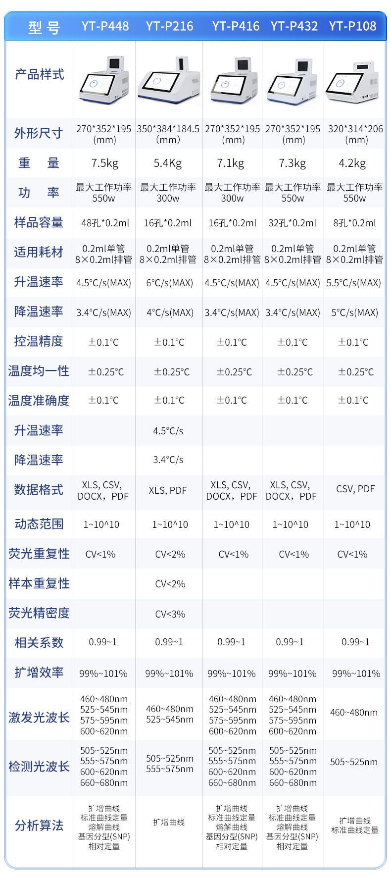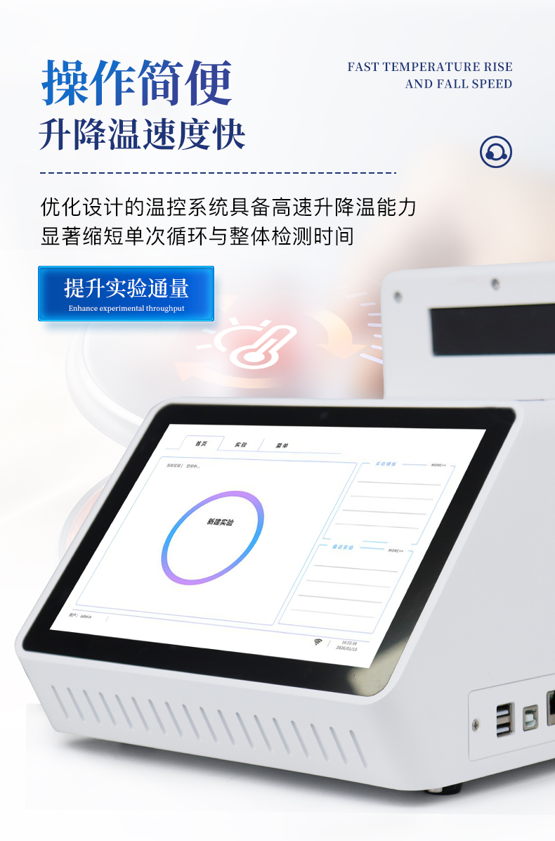 | 1.智能操作系統,實驗盡在掌握 | A雙模式靈活控制:支持通過儀器觸摸屏獨立運行,也支持通過電腦軟件進行遠程控制與數據管理,適應不同實驗場景需求。 | B程序更新與預設:支持在線更新實驗程序,并內置豐富的預設實驗程序模板,用戶亦可自定義保存常用模版,實現一鍵快速啟動,極大提升操作效率。 | C極簡啟動體驗(可選配):可定制集成攝像頭掃描系統,用戶只需掃描樣品板或程序卡的二維碼,即可自動識別并調用對應實驗程序,簡化流程,避免人為設置錯誤。 | D操作簡單:無論是觸摸屏界面還是電腦軟件,均設計得直觀易懂,新用戶也能快速上手。預置常用程序模板,進一步簡化操作流程。 | 2.精準穩定的溫控與光學核心 | A長久精準的溫控系統:采用進口***TEC半導體制冷模塊,控溫精準(±0.1°C),孔間溫度均勻性**(≤±0.3°C)。系統穩定性卓越,長期使用性能衰減小,校準周期長達數年,顯著降低維護成本與運營中斷。 | B免維護的靈敏光學系統:配備4個獨立LED光源與4個獨立光電二極管檢測器,實現四通道熒光同步精準檢測。采用超長壽命進口光源,設計壽命期內免維護,無需額外校準或更換,保障檢測結果長期一致性與高靈敏度。 | C卓越的數據質量:實驗線性相關性高(R2≥0.999),重復性優異(孔間CV值低),確保定量結果準確可靠,數據置信度高。 | 3.**便捷的數據與輸出管理 | A多重數據導出方式:支持通過USB存儲設備直接拷貝,或經由Wi-Fi無線網絡傳輸數據至本地服務器或云端,方便靈活,滿足各類實驗室數據管理習慣。 | B豐富的報告導出與打印:支持生成并導出多種格式(如PDF、Excel)的實驗報告。儀器兼容USB熱敏打印機、藍牙無線打印機及常規A4打印機,可直接在儀器上或通過電腦一鍵導出并打印專業報告,便于結果存檔與即時分享。 | 4.快速**與堅固耐用 | A升降溫速度快:優化設計的溫控系統具備高速升降溫能力,顯著縮短單次循環與整體檢測時間,提升實驗通量。 | B超長使用壽命:核心部件均選用工業級耐用材料與設計,整機運行穩定可靠,致力于為用戶提供長久的投資回報。 |